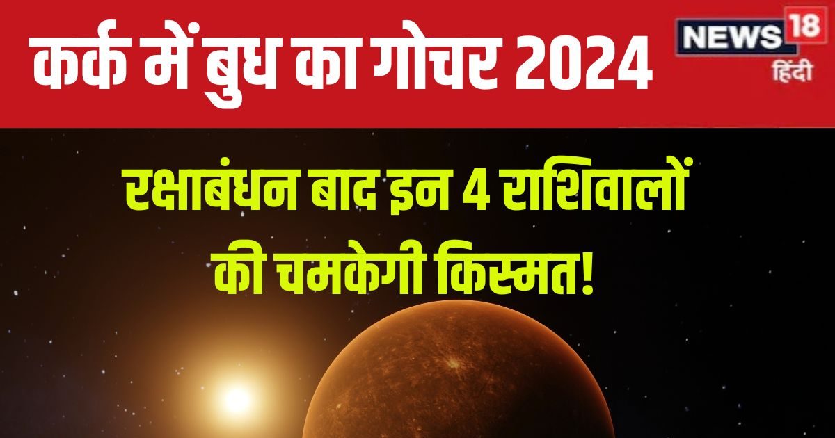 Budh Gochar August 2024 rashi par prabhav: रक्षाबंधन के बाद बुध ग्रह अपना राशि परिवर्तन करने वाला है. बुध सिंह राशि से निकलकर एक बार फिर कर्क राशि में प्रवेश करेगा. 22 अगस्त को सुबह 6 बजकर 22 मिनट पर पर बुध ग्रह कर्क राशि में गोचर करेगा. वह 4 सितंबर को सुबह 11 बजकर 52 मिनट तक कर्क में रहेगा. बुध के कर्क राशि में आने से 4 राशि के जातकों की बंद किस्मत चमक सकती है. तिरुपति के ज्योतिषाचार्य डॉ. कृष्ण कुमार भार्गव से जानते हैं कि कर्क में बुध गोचर से किन 4 राशिवालों पर शुभ प्रभाव होगा.