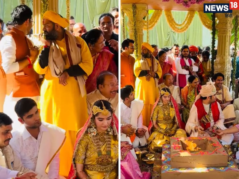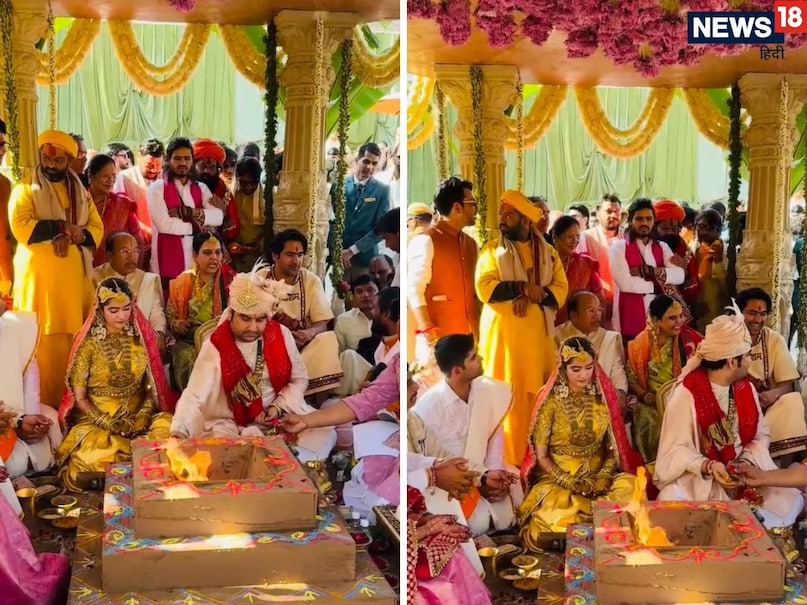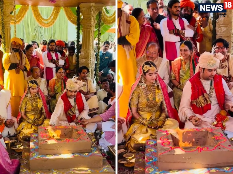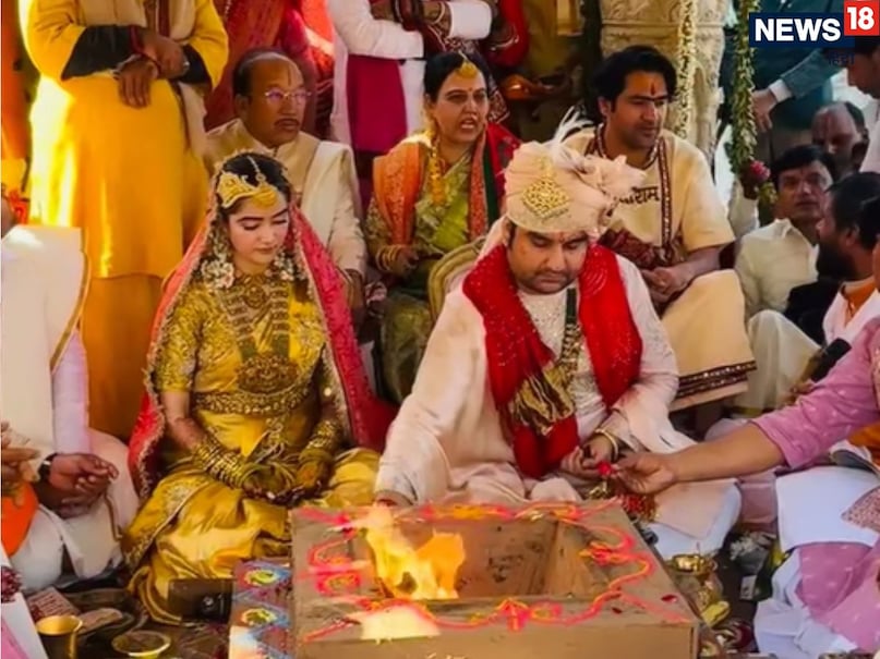 मुख्य रस्में करीब 3 घंटे तक चलीं – वैदिक रीति-रिवाज से हुई शादी की मुख्य रस्में करीब 3 घंटे तक चलीं और विवाह का मंडप तिरुपति बालाजी मंदिर की तर्ज पर बनाया गया था. आप देख रहे होंगे कि दूल्हे राजा के ठीक पीछे धीरेंद्र शास्त्री बैठे हुए हैं. अग्नि के फेरे की रस्म के दौरान देवी चित्रलेखा, भागवत प्रभु सहित कई साधु-संत और सेलिब्रिटी भी मौजूद रहे. इससे पहले जयपुर एयरपोर्ट पर साथ में पहुंचे कुमार विश्वास और धीरेंद्र शास्त्री ने दूल्हा-दुल्हन को शुभकामनाएं दीं.