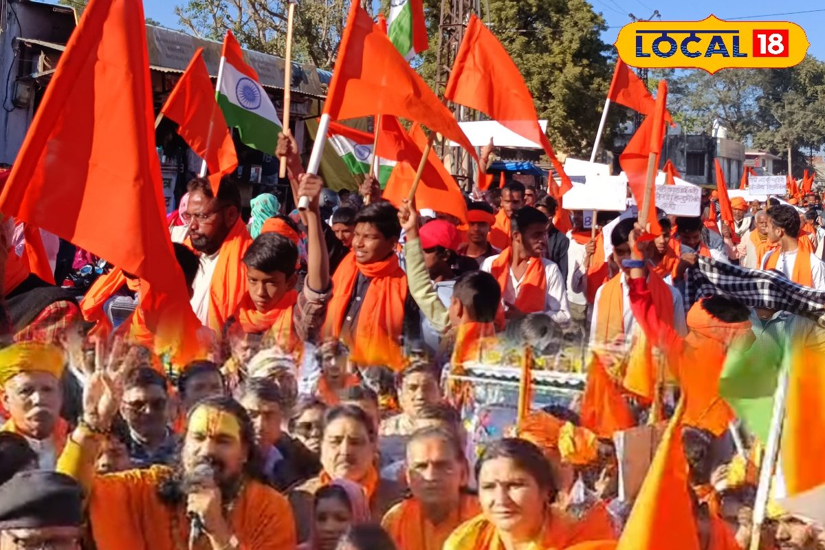 केसरिया ध्वज और तिरंगा झंडा के साथ नारेबाजी