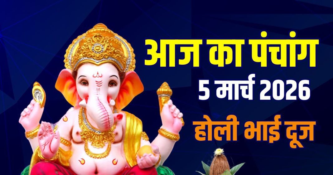 Aaj Ka Panchang (आज का पंचांग), 5 March 2026: आज होली भाई दूज, गुरुवार व्रत और विष्णु पूजा है. पंचांग अनुसार, आज चैत्र कृष्ण द्वितीया तिथि, उत्तराफाल्गुनी नक्षत्र, गर करण, शूल योग, दक्षिण का दिशाशूल और कन्या राशि में चंद्रमा है. आज बहन भाई को दूज का तिलक लगाती है. विष्णु पूजा और गुरुवार व्रत से कष्ट मिटते हैं. गुरुवार को हल्दी का दान करने से गुरु दोष मिटता है. देखें दिनभर के मुहूर्त.