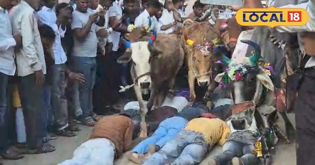 शुभम मरमट / उज्जैन: मध्य प्रदेश की धार्मिक नगरी उज्जैन से करीब 75 किलोमीटर दूर बड़नगर तहसील के भिडावद गांव में गोवर्धन पूजा पर एक अद्वितीय और साहसिक परंपरा का निर्वहन किया जाता है, जिसे “मौत का खेल” भी कहा जाता है. यहां पर दीपावली के अगले दिन गायों की पूजा के बाद लोगों की आस्था के प्रतीक के रूप में यह अनोखी प्रथा निभाई जाती है. इस अनुष्ठान के अंतर्गत मन्नत मांगने वाले लोग जमीन पर लेट जाते हैं और उनके ऊपर से सैकड़ों गायें दौड़ते हुए निकलती हैं. यह परंपरा सिर्फ एक धार्मिक कृत्य नहीं है, बल्कि गांववालों के लिए एक पुरानी मान्यता है जो पीढ़ियों से चली आ रही है.