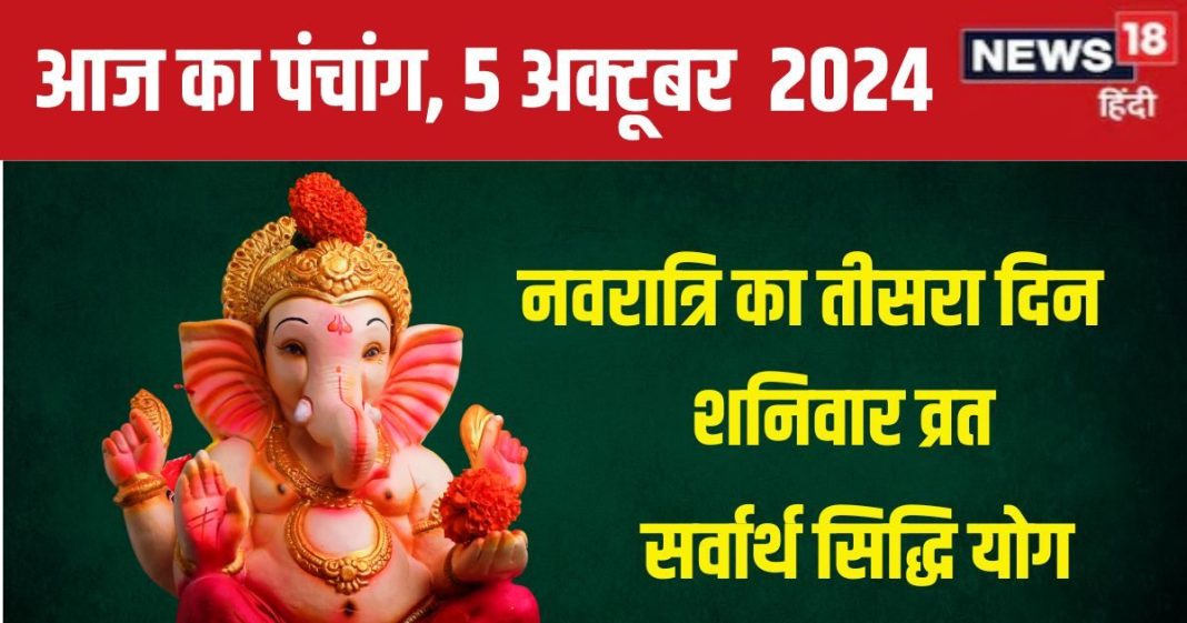 आज का पंचांग, 5 अक्टूबर 2024: शारदीय नवरात्रि का तीसरा दिन 5 अक्टूबर को है. इस दिन अश्विन शुक्ल तृीया तिथि, स्वाति नक्षत्र, विष्कंभ योग, तैतिल करण, पूर्व का दिशाशूल और तुला राशि का चंद्रमा है. इस दिन मां चंद्रघंटा की पूजा करती हैं. मां चंद्रघंटा को मां दुर्गा का तीसरा स्वरूप कहा जाता है. इस देवी के माथे पर घंटे के आकार का चंद्रमा होता है, इसलिए इनको देवी चंद्रघंटा कहते हैं. यह सिंह पर सवार होने वाली 10 भुजाओं वाली माता हैं. इनको पूजा के समय पीले फूल, सफेद कमल चढ़ाना चाहिए. इस देवी को दूध से बनी खीर, मिठाई, सेब, केला आदि का भोग लगा सकते हैं. मां चंद्रघंटा की पूजा करने से शत्रुओं पर विजय प्राप्त होती है. सुख, समृद्धि, सुरक्षा आदि प्राप्त होता है. शुक्र दोष दूर करने के लिए भी मां चंद्रघंटा की पूजा करते हैं. उनकी कृपा से जल्द विवाह के भी योग बनते हैं.