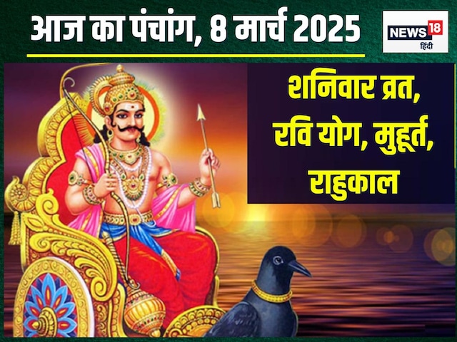 आज का पंचांग, 8 मार्च 2025: आज रवि योग में शनिवार व्रत है. यह योग पूरे दिन रहेगा. आज फाल्गुन शुक्ल नवमी तिथि, आर्द्रा नक्षत्र, आयुष्मान् योग, कौलव करण, पूर्व का दिशाशूल और मिथुन राशि का चंद्रमा है. शनिवार को कर्मफलदाता शनि देव की पूजा करते हैं. सुबह में स्नान के बाद शनिवार व्रत और शनि देव की पूजा का संकल्प करें. उसके बाद शनि देव के मंदिर में जाकर विधिपूर्वक पूजन करें. शनि महाराज को नीले फूल, शमी के पत्ते, सरसों का तेल, धूप, दीप आदि अर्पित करें. उसके बाद शनि चालीसा, शनि स्तोत्र का पाठ करें. उसके बाद शनिवार की व्रत कथा पढ़ें. साढ़ेसाती या ढैय्या की दशा चल रही है तो आप छाया दान करें. इसके लिए एक कटोरे में सरसों या तिल के तेल को भर लें, उसमें अपनी छाया देखें. उसके बाद उस तेल को बर्तन सहित किसी गरीब या जरूरतमंद को दान करें. इस उपाय से साढ़ेसाती और ढैय्या के दुष्प्रभाव में कमी आती है.
