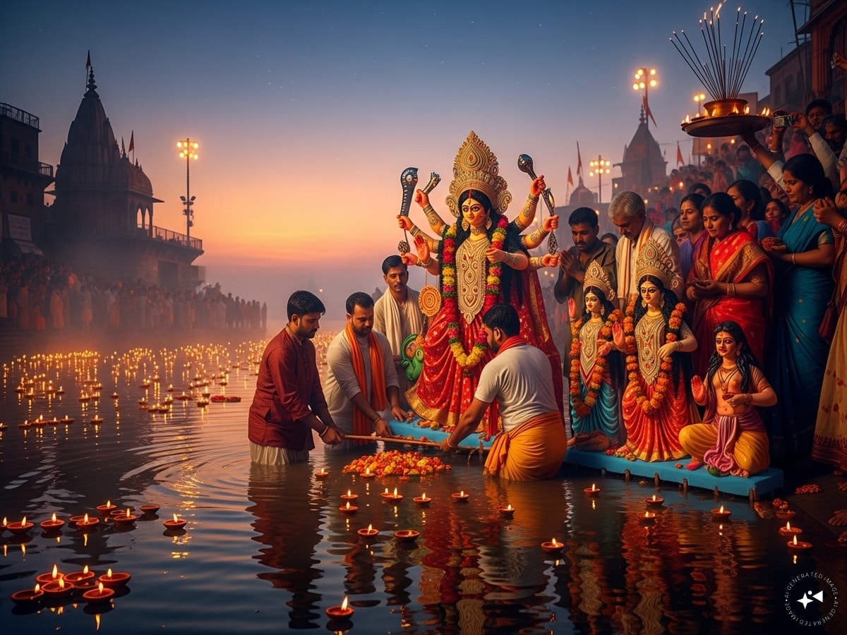 मां दुर्गा की मूर्तियों का विसर्जन विधि विधान से नदी, तालाब या अन्य जल स्तोत्र में किया जाएगा. मां दुर्गा से अगले साल फिर आने का निवेदन किया जाएगा और उनका विसर्जन होगा. मां दुर्गा पृथ्वी लोक से कैलाश वापस चली जाएंगी. इस बार माता का प्रस्थान पालकी में हो रहा है, जो उनके भक्तों के लिए सुख और समृद्धि का प्रतीक है.