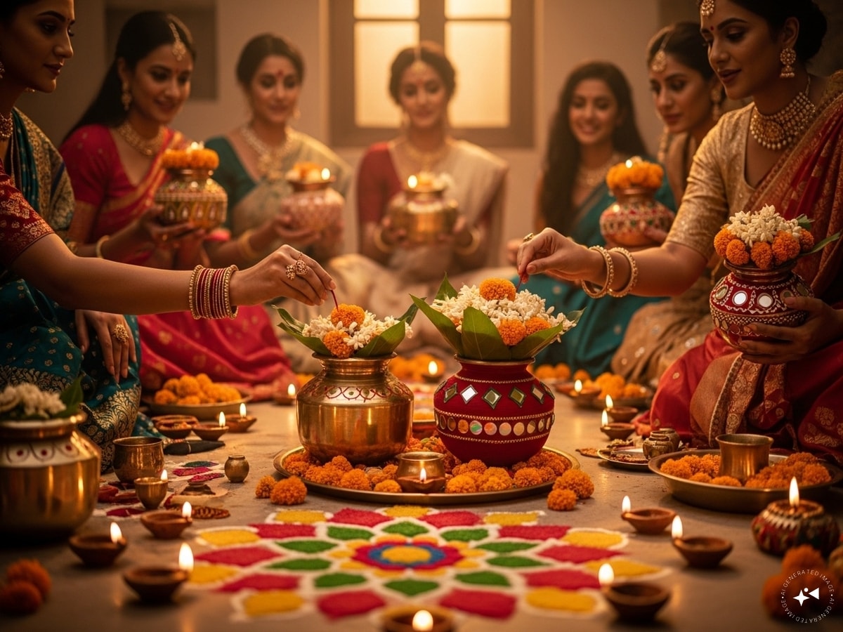 शाम को महिलाएं पूजा के लिए तैयार होती हैं और करवा यानी मिट्टी या धातु के पात्र को सजाती हैं. उसमें पानी, चावल, मिठाई और सिंदूर रखा जाता है. पूजा स्थल को रंगोली, दीपक और फूलों से सजाया जाता है. करवा चौथ की कथा सुनने के लिए महिलाएं एक साथ इकट्ठा होती हैं.