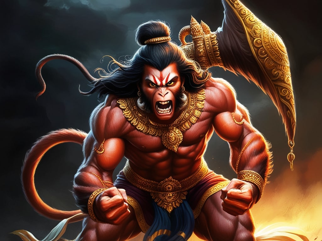 हनुमान युद्ध के मैदान में कर्ण की हरकत पर इतने नाराज हुए कि वह उसको मारने के लिए दौड़ पड़े. तब कृष्ण ने शांत किया. (Image generated by Leonardo AI)