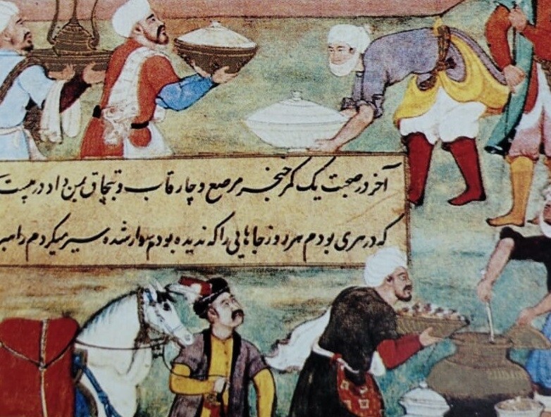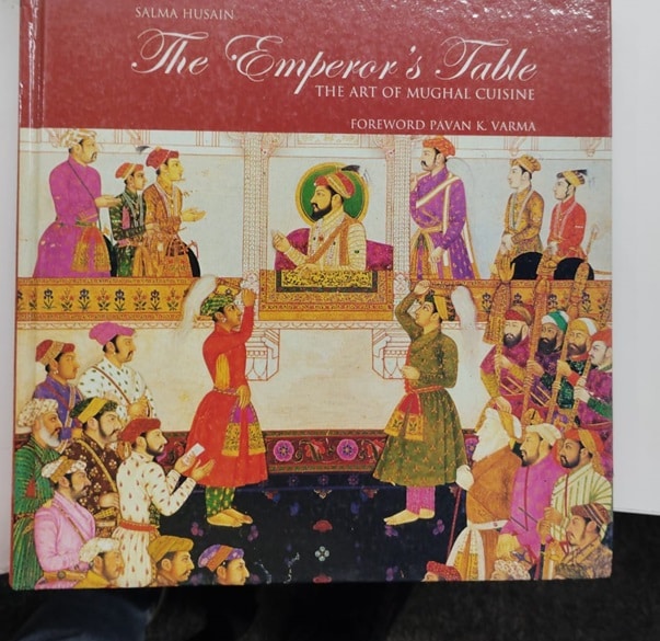 सलमा हुसैन की किताब “द एम्परर्स टेबल – द आर्ट ऑफ मुगल कुजीन ” में बताया गया है, भोजन फर्श पर खाया जाता था. चमड़े से बनी और सफेद फ़ारसी केलिको से ढकी चादरें महंगे कालीनों की रक्षा करती थीं. इसे दस्तरख्वान कहा जाता था. राजा के लिए भोजन करने से पहले गरीबों के लिए भोजन का एक हिस्सा अलग रखना प्रथा थी. सम्राट अपने भोजन की शुरुआत और समाप्ति प्रार्थना से करते थे.