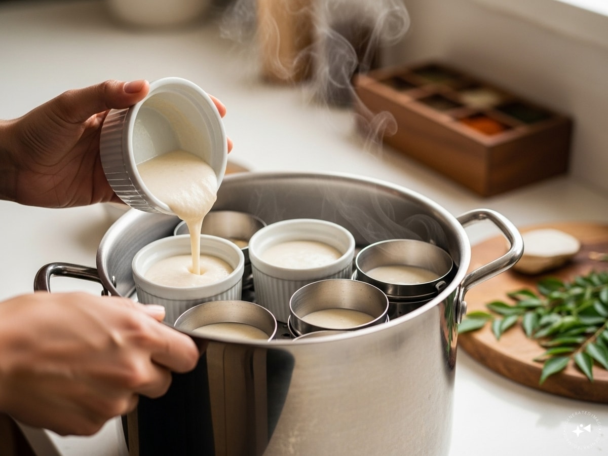 अब बारी आती है इडली पकाने की. पहला तरीका है कटोरी स्टाइल. एक गहरे बर्तन में 1–2 गिलास पानी डालें और उसमें प्लेट या जाली रखें. फिर छोटी कटोरियों में ग्रीस किया हुआ बैटर डालें. कटोरियों को प्लेट के ऊपर रखकर ढक दें और मध्यम आंच पर 15–20 मिनट तक भाप में पकाएं. कटोरी निकालकर चेक करें, अगर इडली सेट हो गई है तो निकाल लें.