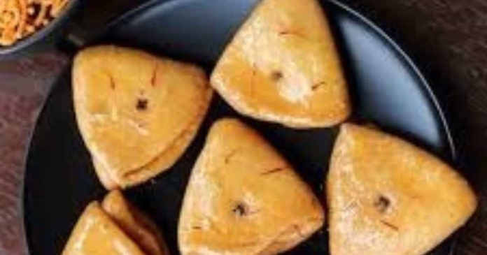 आटे की छोटी-छोटी लोइयां बनाएं. हर लोई को गोल बेलें, ऊपर तेल लगाकर फोल्ड करें और फिर से फोल्ड करें ताकि तिकोना आकार बने. एक कोने में लौंग लगाएं. - तलना और चाशनी में डालना