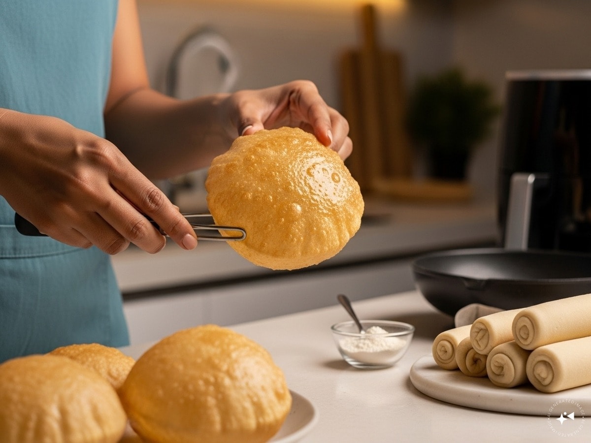 अब सबसे मजेदार हिस्सा – एयर फ्रायर. इसे 180 डिग्री पर प्री-हीट करें. फिर पूड़ियों को 4 मिनट के लिए बैक करें. एयर फ्रायर की वजह से पूड़ियां बिना तेल के भी बिल्कुल फूली और क्रिस्पी बन जाएंगी.