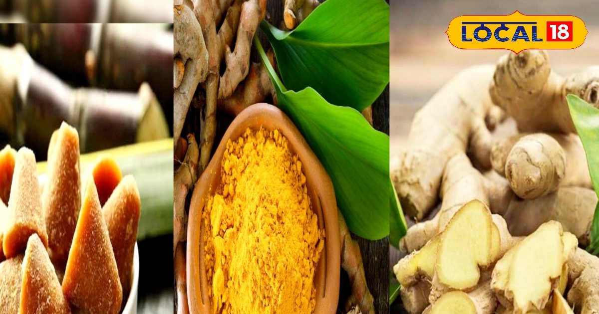 Benefits of ginger, jaggery, and turmeric: मौसम तेजी से बदल रहा है.ऐसे में हमें अपन ख्याल रखना जरूरी है. सर्दियों में हल्दी, अदरक, और गुड़ जैसे सुपरफूड्स आपकी इम्यूनिटी को बढ़ाकर ठंड से बचाते हैं. डॉक्टर भी मानते हैं कि अदरक, गुड़ और हल्दी शरीर की प्राकृतिक रोग प्रतिरोधक क्षमता को बढ़ाने में मददगार हैं. रसोई का हर मसाला, सेहत का रखवाला होता है. अदरक, गुड़ और हल्दी इसका सबसे बड़ा उदाहरण हैं. आप भी इसका संतुलित प्रयोग् कर सकते हैं.