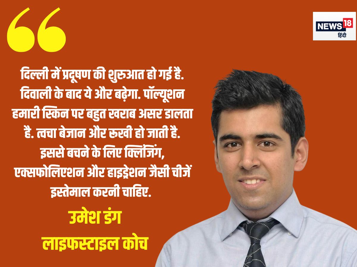 लाइफस्टाइल कोच और गैलेक्सी यूनिसेक्स सैलून के फाउंडर उमेश डंग ने बताया कि जब हवा जहरीली हो जाती है, तब उससे त्वचा में जलन, रूखापन और खुजली जैसी समस्याएं हो सकती हैं. ये तत्व त्वचा की नमी को कम कर देते हैं, जिसके परिणामस्वरूप त्वचा बेजान और थकी हुई दिखने लगती है. इसके अलावा प्रदूषण और धूल के कारण रैशेज और मुंहासे भी हो सकते हैं, जो त्वचा की सेहत को बुरी तरह प्रभावित करते हैं. इन समस्याओं से बचने के लिए एयर पॉल्यूशन में त्वचा की देखभाल करना बेहद जरूरी है. इस मौसम में सबसे ज्यादा जरूरत त्वचा की नमी को बरकरार रखने की होती है.