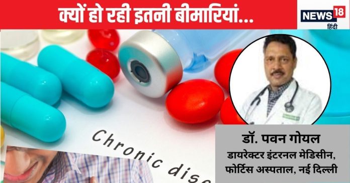 Chronic Disease Rise in India: भारत बीमारियों के मकड़जाल में फंसता जा रहा है. यहां क्रोनिक बीमारियों को लोड दिन प्रतिदिन बढ़ता जा रहा है जिसके कारण अरबो डॉलर रुपया न चाहते हुए भी बीमारियों पर खर्च हो रहा है. एम्स की एक रिपोर्ट के मुताबिक भारत में 35 प्रतिशत लोगों को फैटी लिवर डिजीज है. वहीं हेल्थ मिनिस्ट्री के मुताबिक 2023 में भारत में 14.96 लाख कैंसर के नए मामले सामने आए.जामा नेटवर्क के मुताबिक भारत में 22 करोड़ लोगों को हाई ब्लड प्रेशर है.हाई ब्लड प्रेशर हार्ट अटैक की एक प्रमुख वजह है. इसी तरह भारत में 10 करोड़ लोगों को डायबिटीज है. चिंता की बात यह है कि कम से कम आधे लोगों को पता ही नहीं कि उन्हें हाई ब्लड प्रेशर या डायबिटीज है. ये सारी बीमारी नॉन-कम्युनिकेबल यानी क्रोनिक बीमारियों की श्रेणी में आती है. तो ऐसा क्या कारण है भारत में क्रोनिक बीमारियों के मामले बढ़ते जा रहे हैं, इस विषय पर हमने फोर्टिस अस्पताल में इंटरनल मेडिसीन के डायरेक्टर डॉ. पवन कुमार गोयल से बात कर जानना चाहा कि ऐसा क्यों हो रहा है और इससे निकलने के क्या उपाय है.