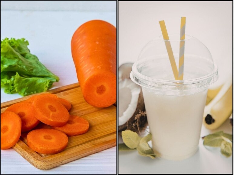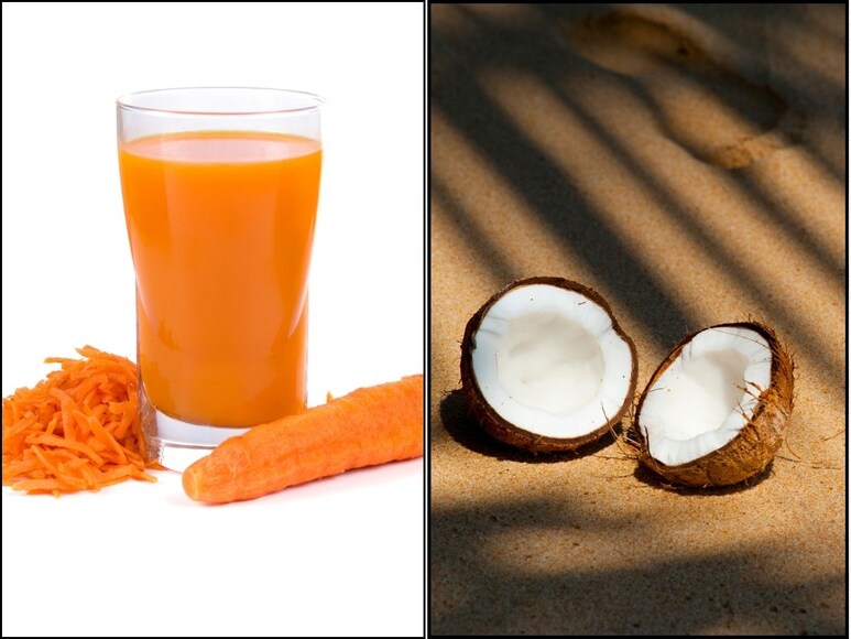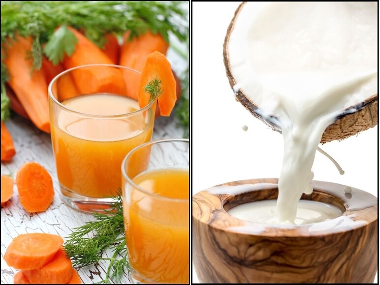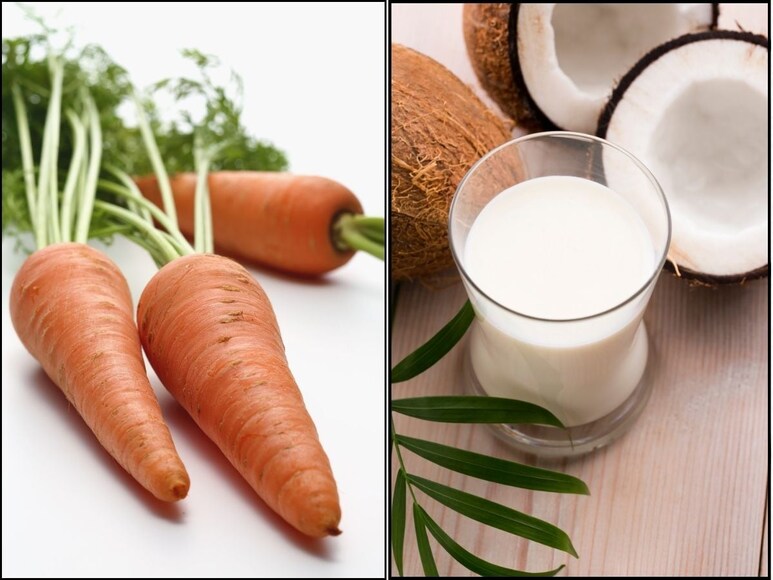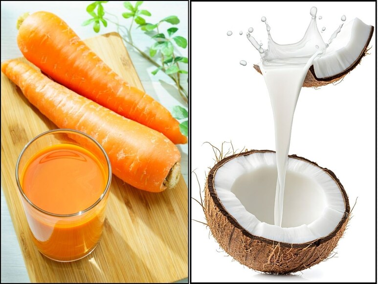 2. चमकदार त्वचा: गाजर में बीटा कैरोटीन होता है. ये शरीर को जरूरी विटामिन ए देता है. ये विटामिन त्वचा को चमकदार बनाता है. समय के साथ, त्वचा की सुस्ती कम होती है और रंगत बेहतर होती है. नारियल दूध में मौजूद फैट्स त्वचा को ग्लो देते हैं. साथ ही ये त्वचा की नमी को बनाए रखते हैं और नेचुरली फ्रेश रखते हैं. गाजर के जूस में मौजूद एंटीऑक्सीडेंट्स ऑक्सीडेटिव स्ट्रेस को कम करने में मदद करते हैं. इससे त्वचा की जवानी बनी रहती है.