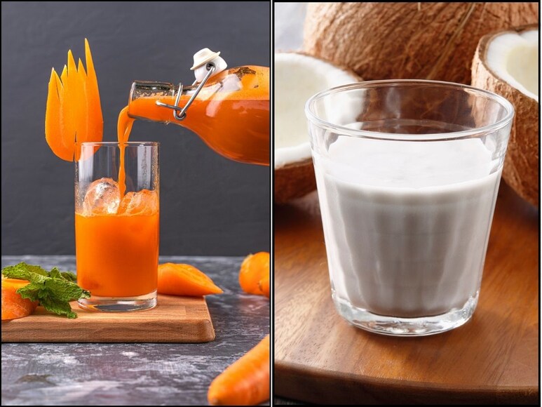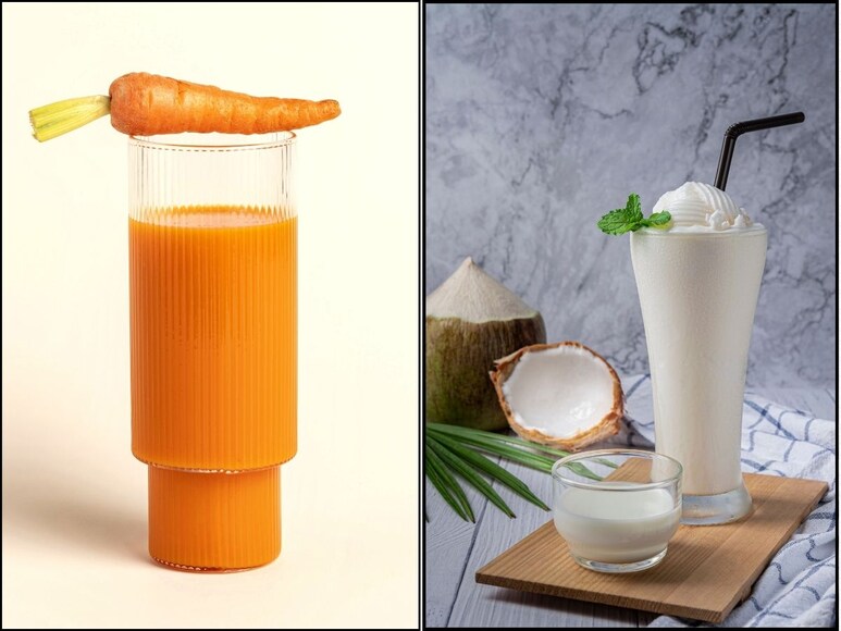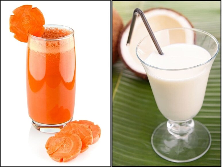गाजर के जूस में नारियल दूध मिलाकर पीना आजकल ट्रेंड बन गया है. कैफे के मेन्यू में भी ये जूस शामिल हो गया है और इसे घर पर भी आसानी से बनाया जा सकता है. गाजर और नारियल दोनों में हल्की मिठास होती है, इसलिए दोनों को मिलाकर जूस बनाने पर इसका स्वाद और भी अच्छा हो जाता है. ये ड्रिंक पेट भरने का एहसास देता है और साथ ही पोषक तत्व भी देता है. नारियल दूध में मौजूद फैट्स, गाजर में मौजूद बीटा कैरोटीन को अच्छे से सोखने में मदद करते हैं. दोनों चीजें मिलकर स्वाद को भी बढ़ा देती हैं.