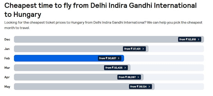 उड़ने के लिए सबसे सस्ता महीना:- Skyscanner.com के अनुसार, उड़ने के लिए सबसे सस्ता महीना दिसंबर है, जिसमें सबसे सस्ती कनेक्टिंग फ़्लाइट की कीमत लगभग Rs 16,097 (एक तरफ का) है. पश्चिमी यूरोप की तुलना में, हंगरी को आम तौर पर भारतीय यात्रियों के लिए एक बजट-फ़्रेंडली जगह माना जाता है.
