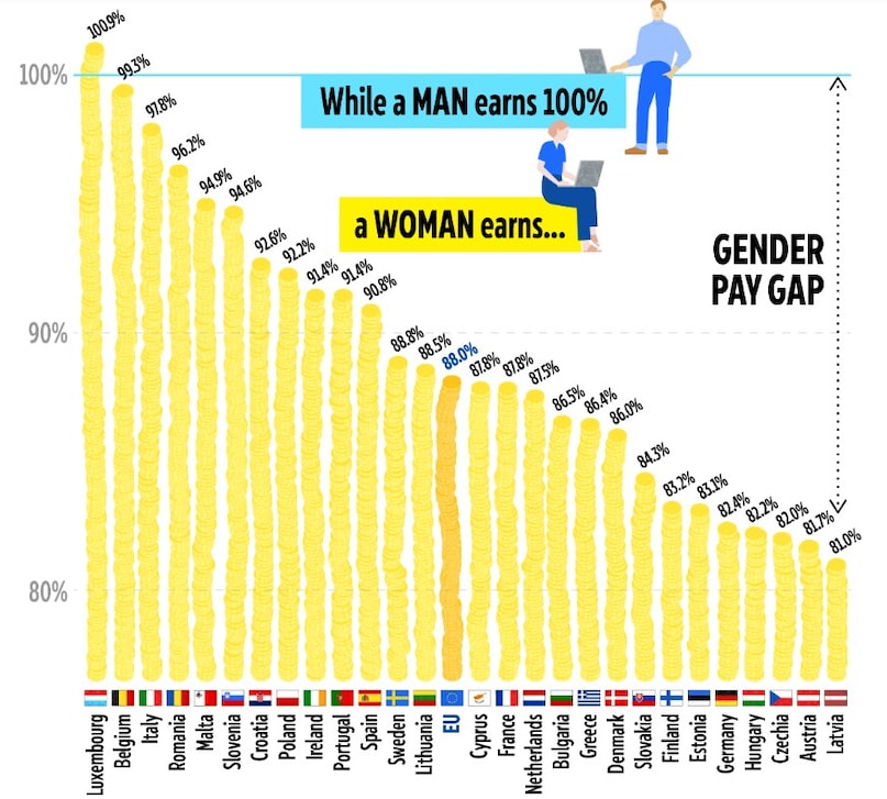 लक्ज़मबर्ग में जेंडर पे गैप लगभग -0.7 प्रतिशत है, यानी महिलाएं पुरुषों से थोड़ी ज्यादा कमाती हैं. यह स्थिति यूरोप ही नहीं, बल्कि पूरी दुनिया में ही रेयर है.