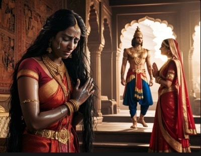 स्वंयवर के बाद जब द्रौपदी पांडवों के साथ घर आई और उसको पता लगा कि अर्जुन नहीं बल्कि पांचों पांडव उसके पति होंगे तो वह बहुत दुखी हुई थी. (Image generated by Leonardio AI)