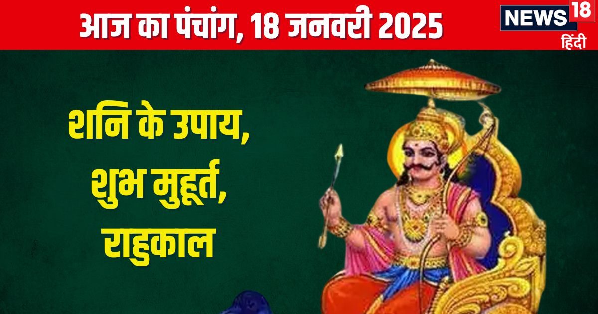आज का पंचांग, 18 जनवरी 2025: शनिवार व्रत के दिन शोभन योग बना है, जो एक शुभ योग है. इस दिन माघ कृष्ण पंचमी तिथि, पूर्वाफाल्गुनी नक्षत्र, शोभन योग, कौलव करण, पूर्व का दिशाशूल और सिंह का चंद्रमा है. शनिवार के दिन कर्मफलदाता शनि देव की पूजा करते हैं. प्रात:काल में स्नान आदि से निवृत होकर साफ कपड़े पहन लें. उसके बाद शनि मंदिर में जाएं. वहां पर न्याय के देवता शनि महाराज को काले तिल, नीले फूल, सरसों के तेल, उड़द की दाल आदि अर्पित करें. धूप, दीप आदि चढ़ाएं. शनि चालीसा और शनिवार व्रत कथा का पाठ करें. सबसे अंत में शनि देव की आरती करें. साढ़ेसाती या ढैय्या का प्रभाव है तो छाया दान कर दें. इससे शनि देव प्रसन्न होंगे और आपके कष्टों को दूर करेंगे.