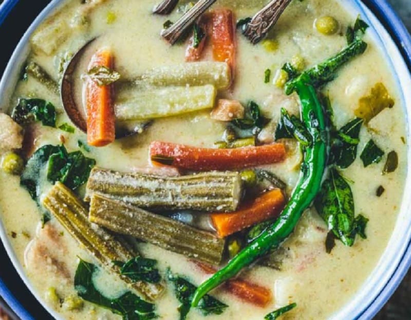 इस व्यंजन का नाम अवियल (Avial) है. ये प्रमुख दक्षिण भारतीय व्यंजन है, जो विशेष रूप से केरल और तमिलनाडु में प्रसिद्ध है. यह व्यंजन विभिन्न प्रकार की सब्जियों, नारियल, दही और मसालों के साथ तैयार किया जाता है. महाभारत की कुछ लोककथाओं में कहा जाता है कि भीम ने अज्ञातवास के दौरान यह व्यंजन तैयार किया था.