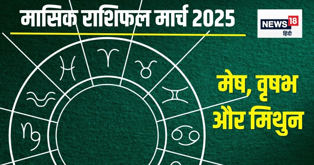 मेष, वृषभ और मिथुन का मार्च 2025 का मासिक राशिफल.