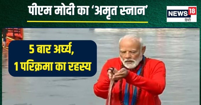 पीएम नरेंद्र मोदी आज प्रयागराज में आयोजित महाकुंभ में पहुंचे, जहां पर उन्होंने त्रिवेणी संगम में आस्था की पवित्र डुबकी लगाई. इस दौरान पीएम मोदी गेरुआ वस्त्र और गले में रुद्राक्ष की माला पहने एक योगी की तरह दिख रहे थे. पीएम मोदी ने स्नान के समय रुद्राक्ष की माला से मंत्र जाप किया और फिर अपने हाथों की अंजुलि से 5 बार जल अर्पित किया, उसके बाद चारों दिशाओं में परिक्रमा की. इस दौरान पीएम मोदी ने देवी और देवताओं को प्रणाम करके विश्व कल्याण की कामना की. पीएम मोदी का स्नान के बाद 5 बार जल अर्पित करना और परिक्रमा करने का धर्म और अध्यात्म से जुड़ा एक रहस्य है.